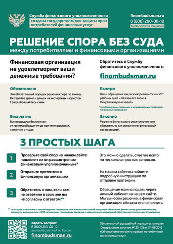 В листовках представлена информация службы финансового уполномоченного по теме "Решение спора без суда между потребителями и финансовыми организациями"